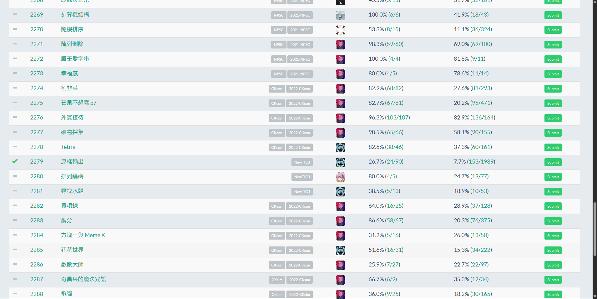 submit: 上傳程式碼,讓 OJ 驗證該程式是否能在指定的時間與空間限制內輸出正確的答案
