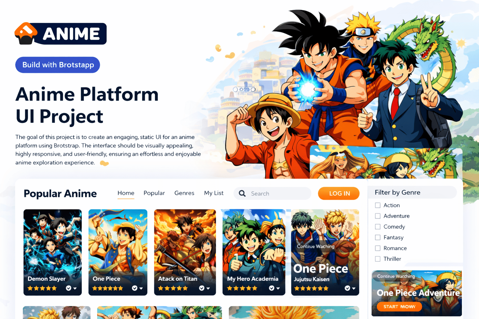 The goal of this project is to create an engaging, static UI for an anime platform using Bootstrap. The interface should be visually appealing, highly responsive, and user-friendly, ensuring an effortless and enjoyable anime exploration experience