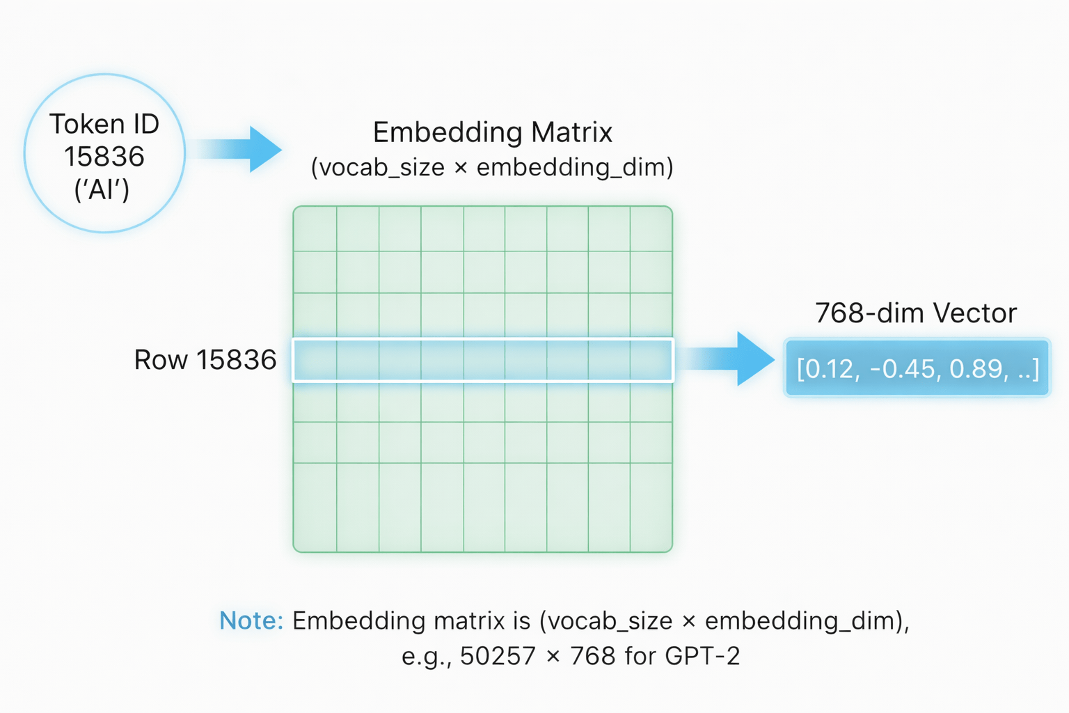 Integer maps to vector via embedding table