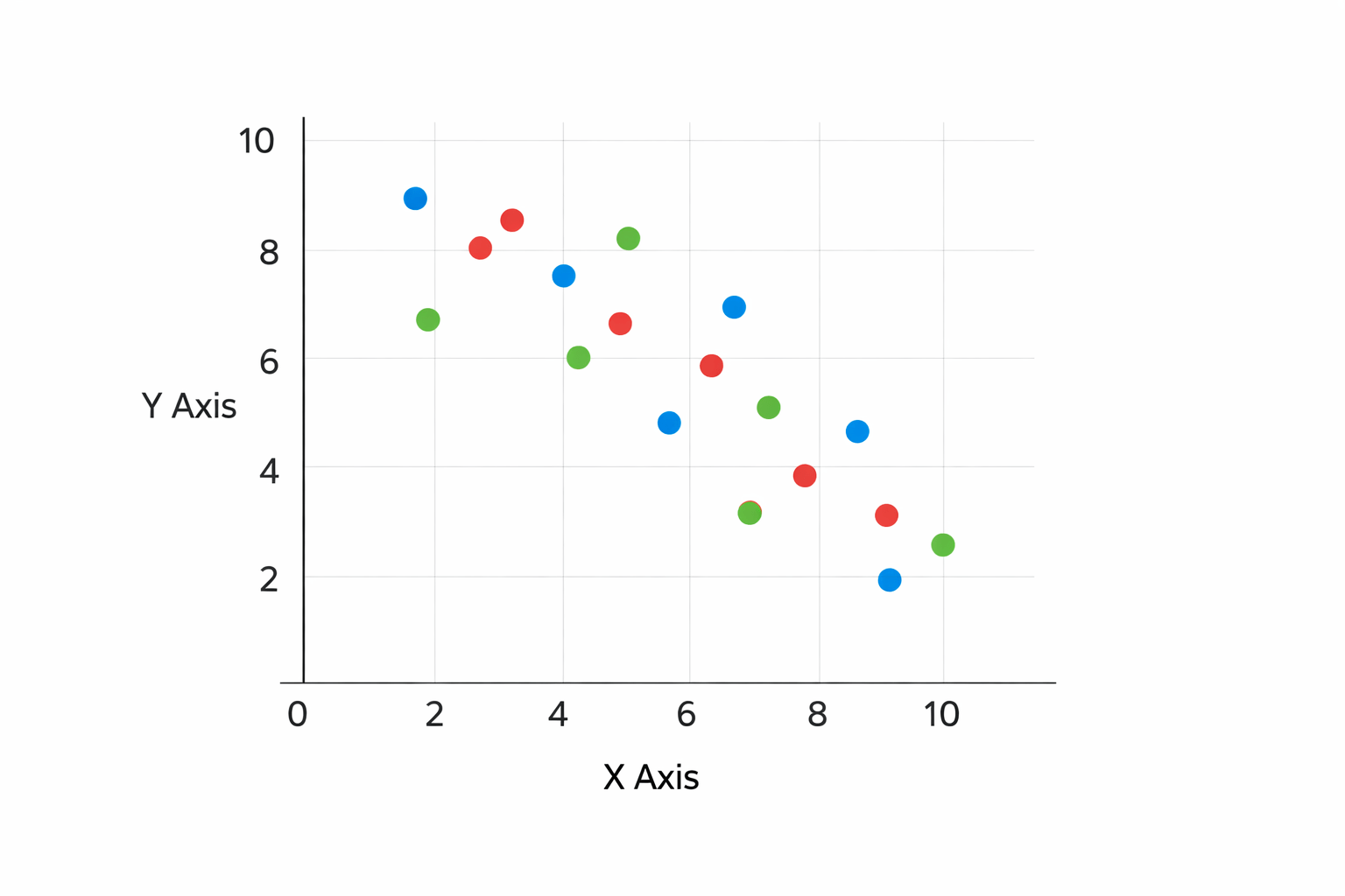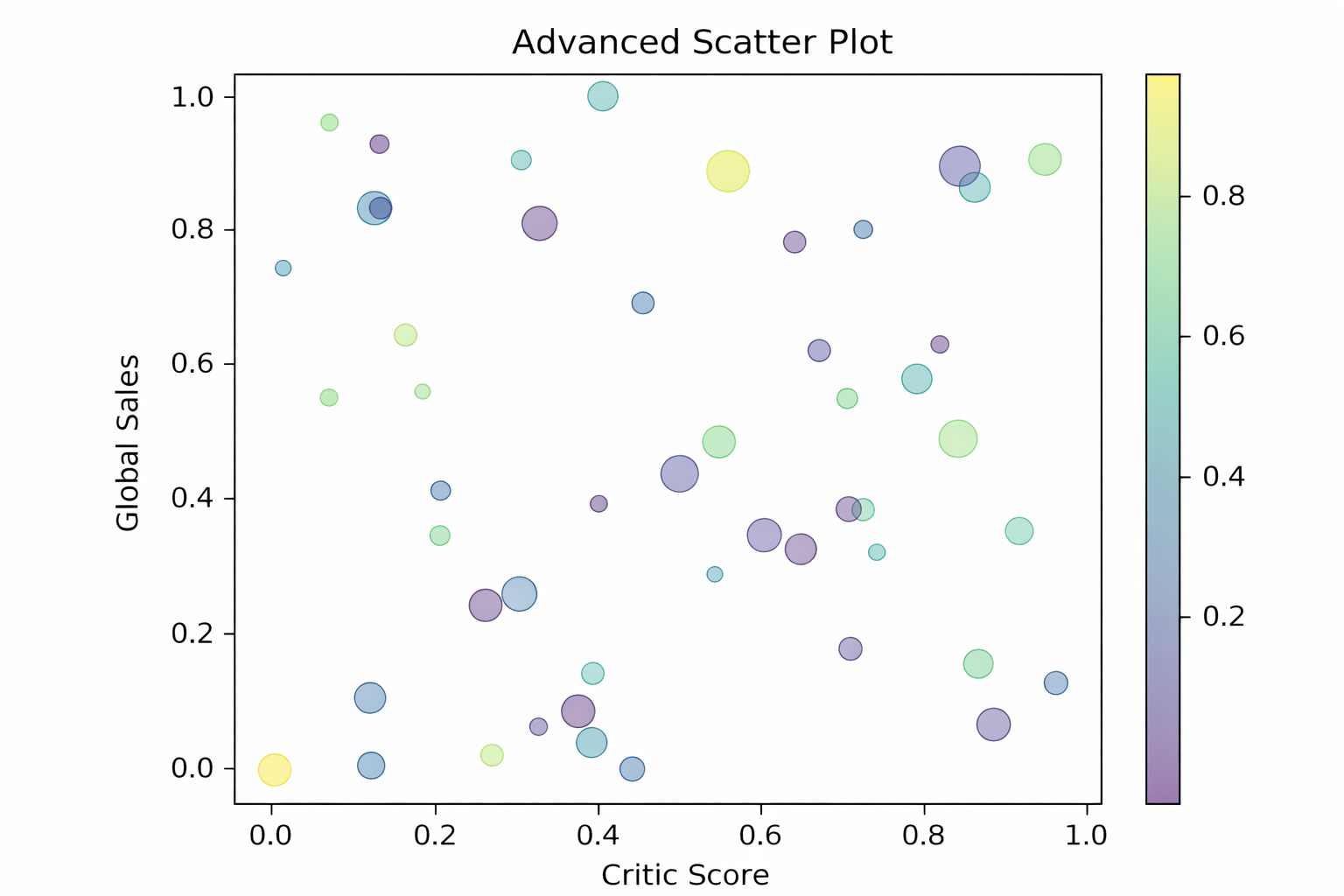 Marker size and color can represent additional variables such as sales volume or popularity.