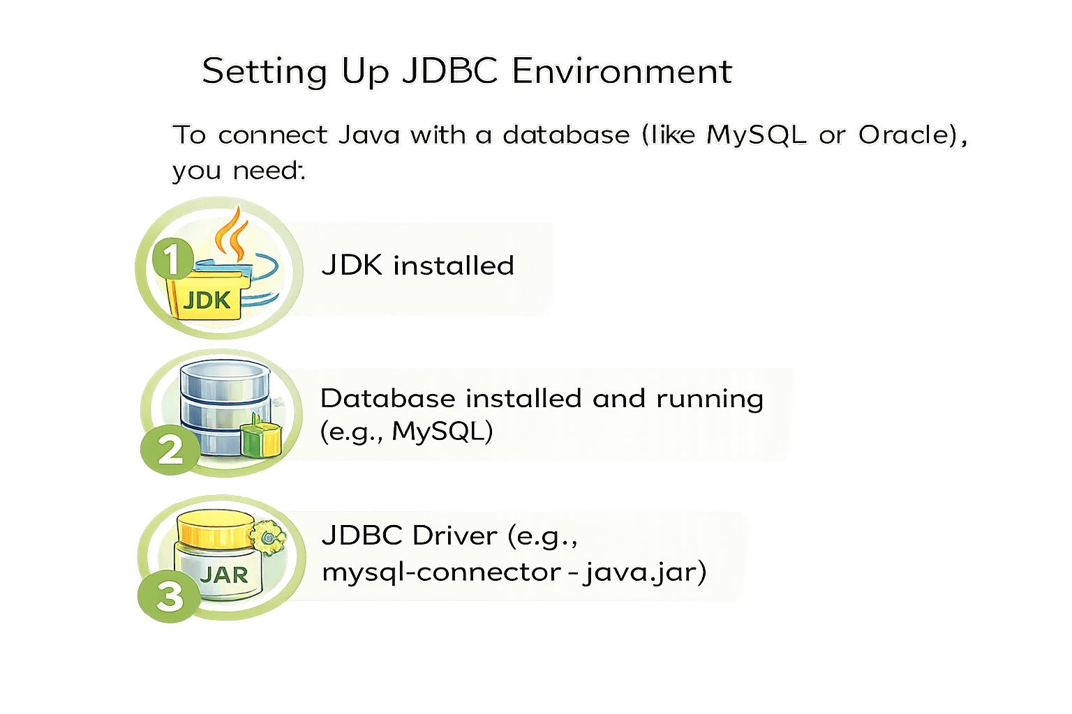 Import JDBC Package: Include java.sql.* to access core JDBC classes like Connection and DriverManager.