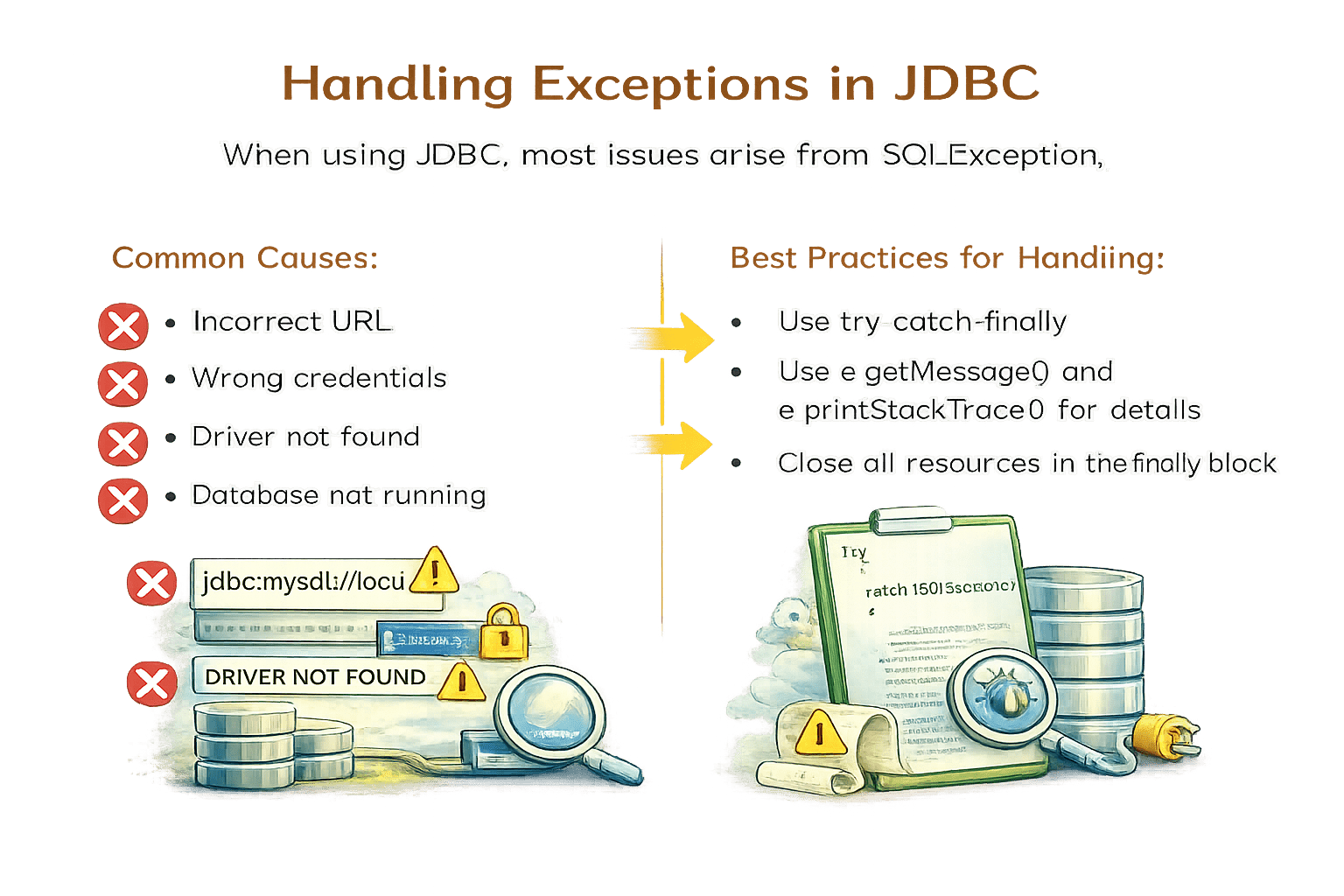Identify common JDBC exceptions and their causes.