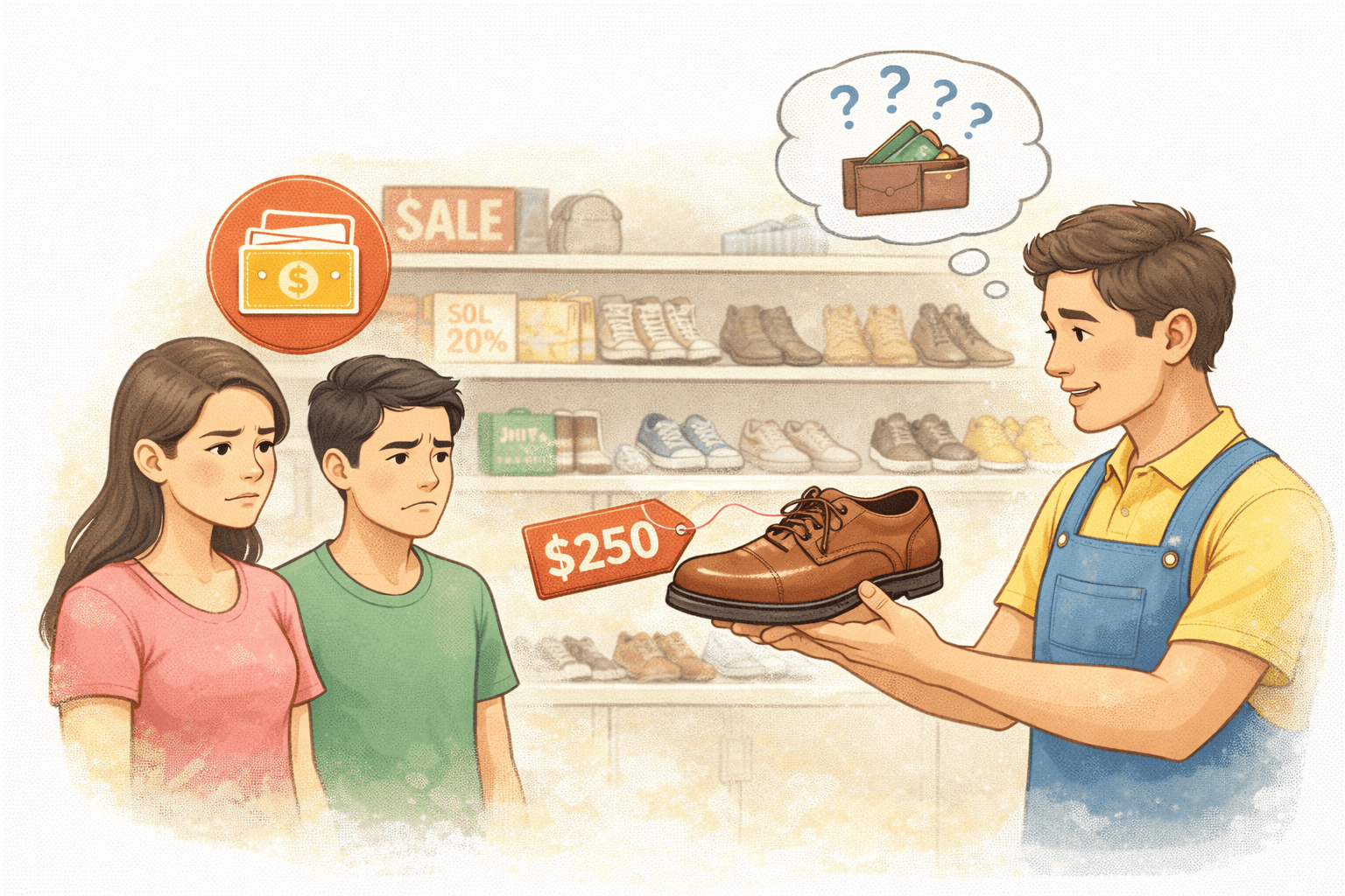 He shows expensive shoes to low-budget customers