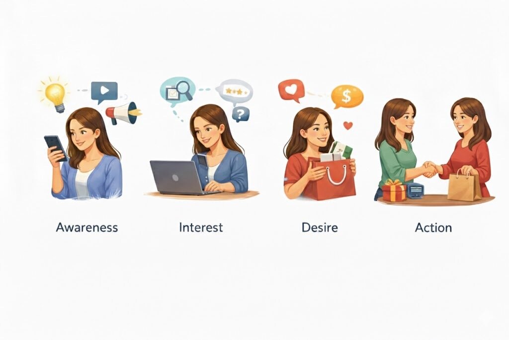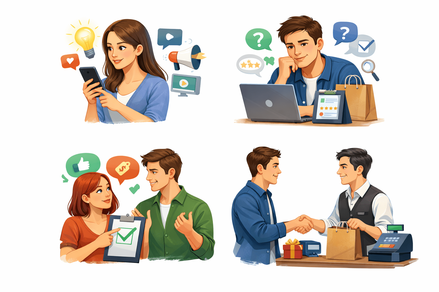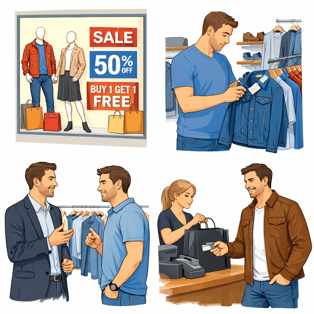 The salesman explains offers and benefits, and the customer feels desire to buy