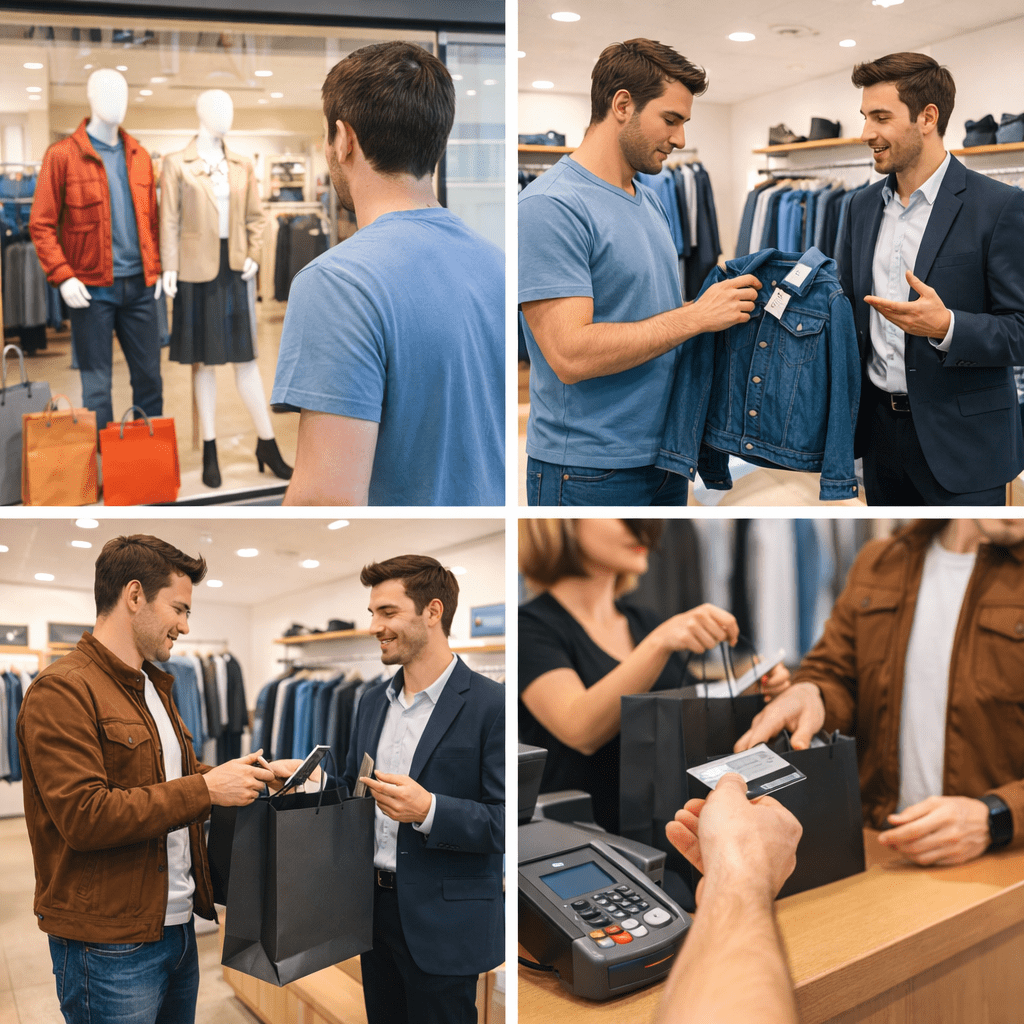 Inside, he sees stylish clothes and starts checking prices and quality with interest