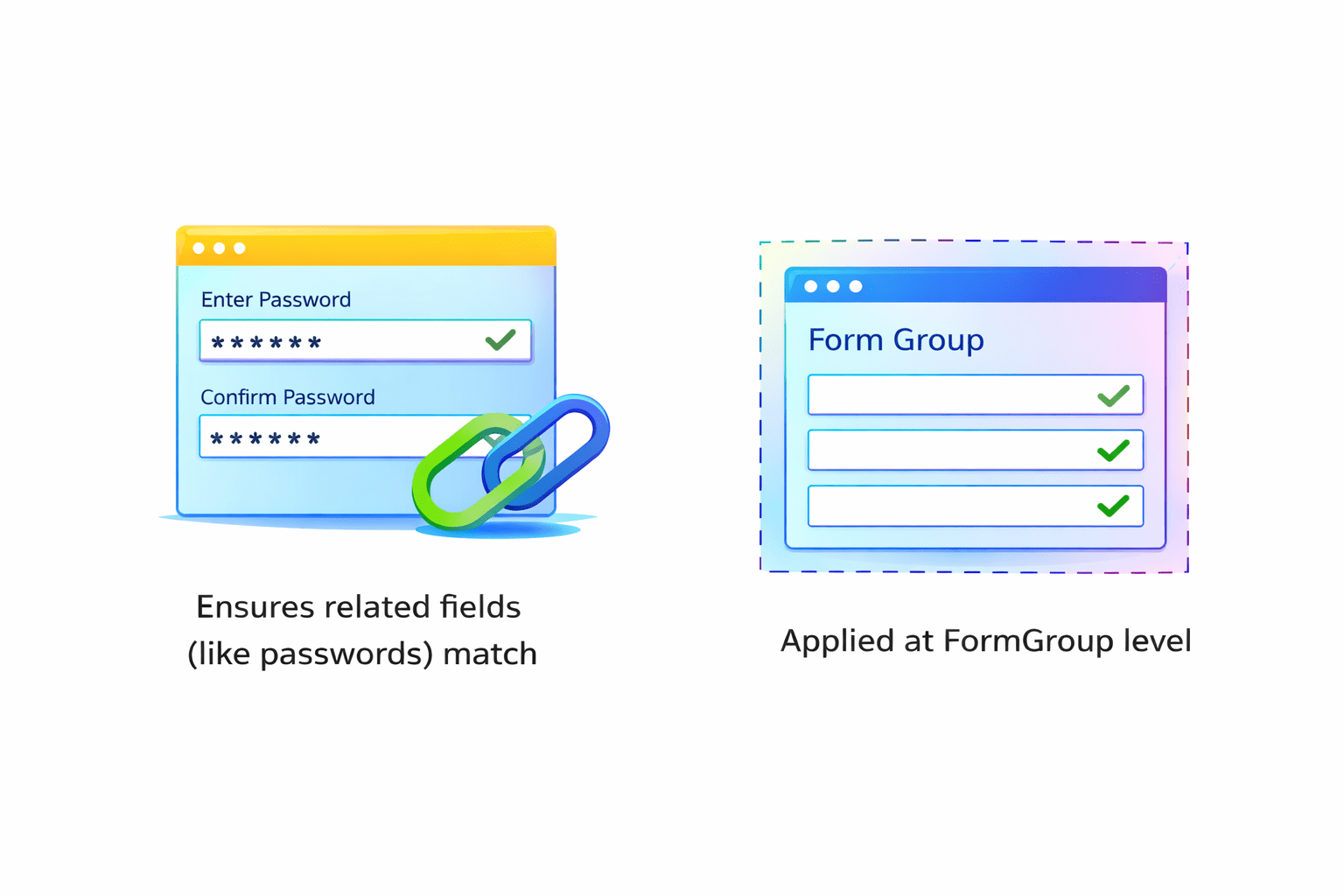 Ensures related fields (like passwords) match