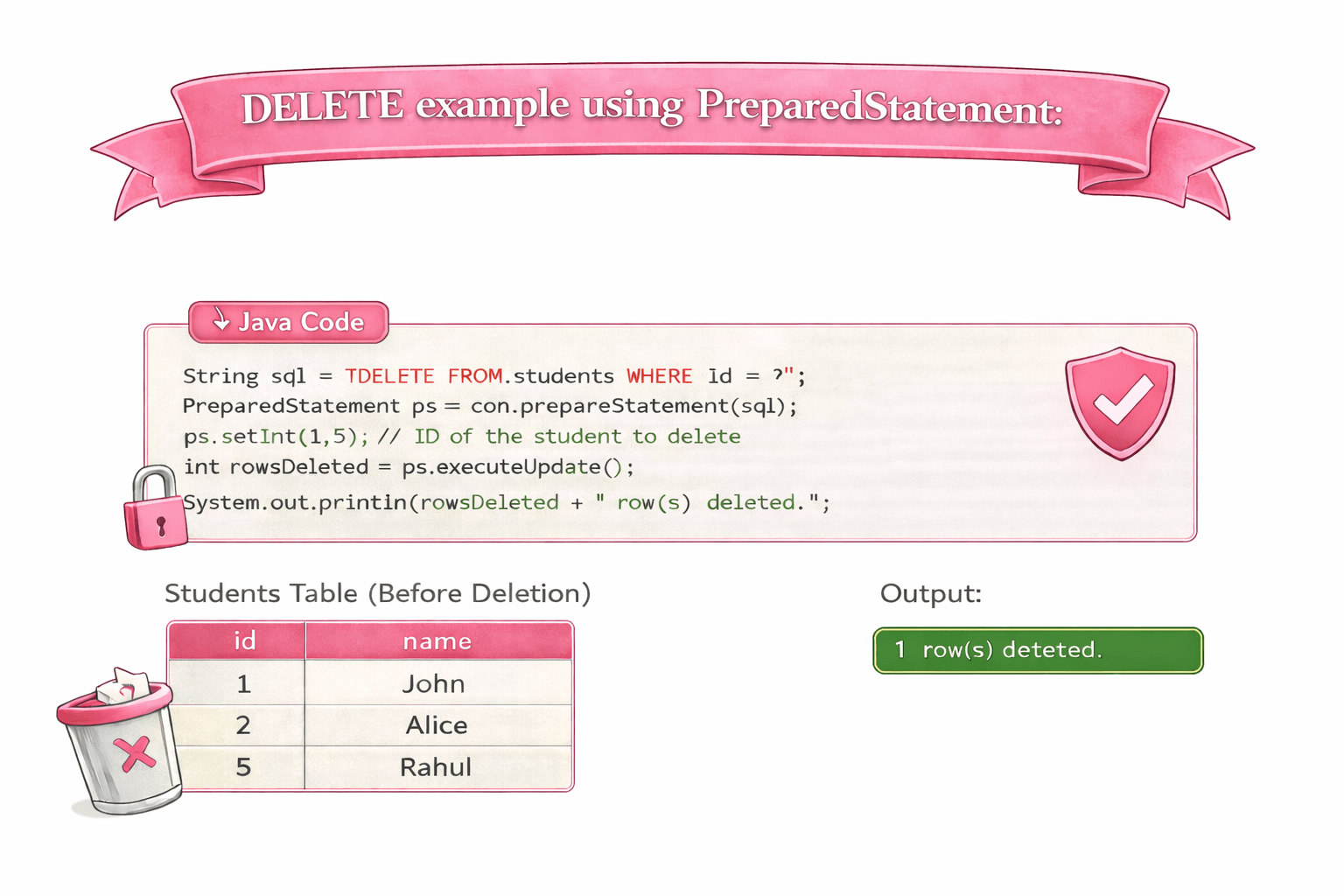 INSERT, UPDATE, DELETE → use PreparedStatement + executeUpdate().