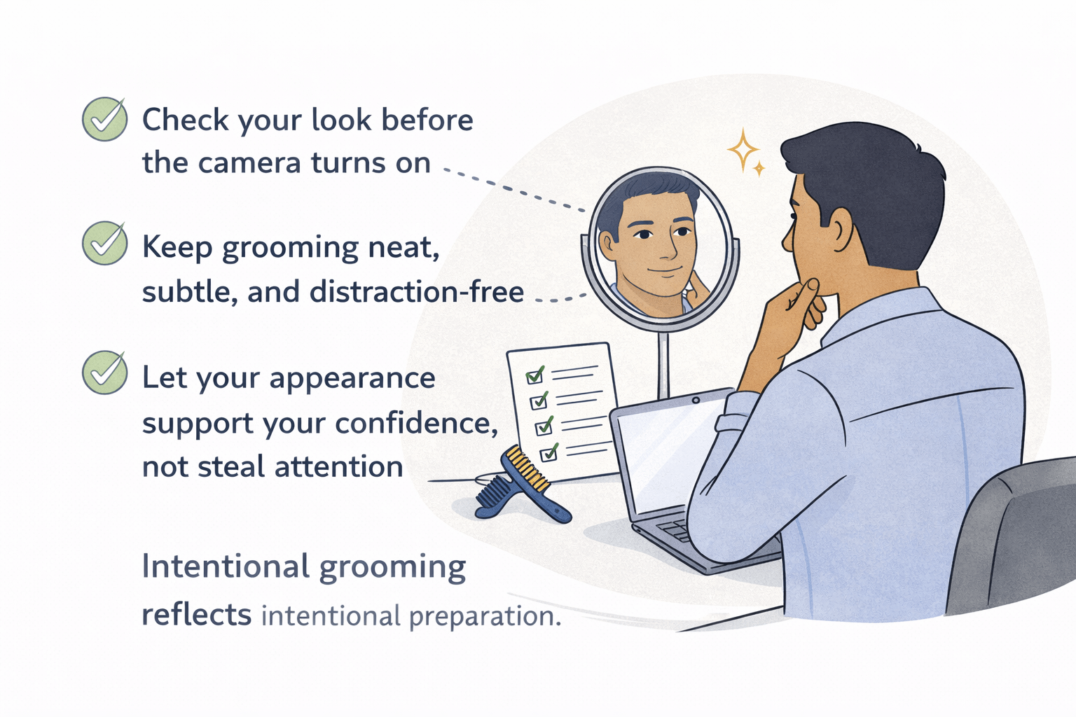 Keep grooming neat, subtle, and distraction-free