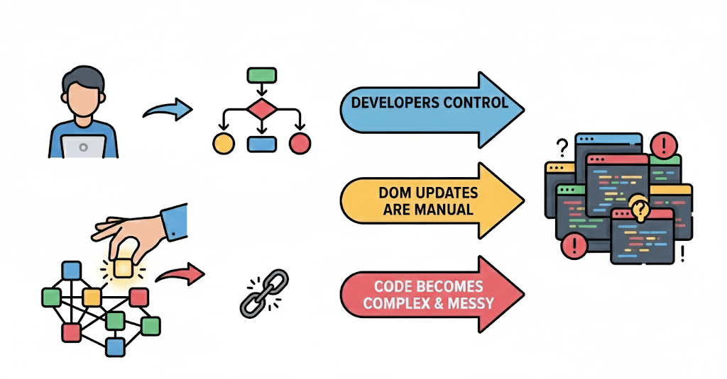 This is exactly how plain JavaScript UI updates work in large apps — manual and hard to manage.
