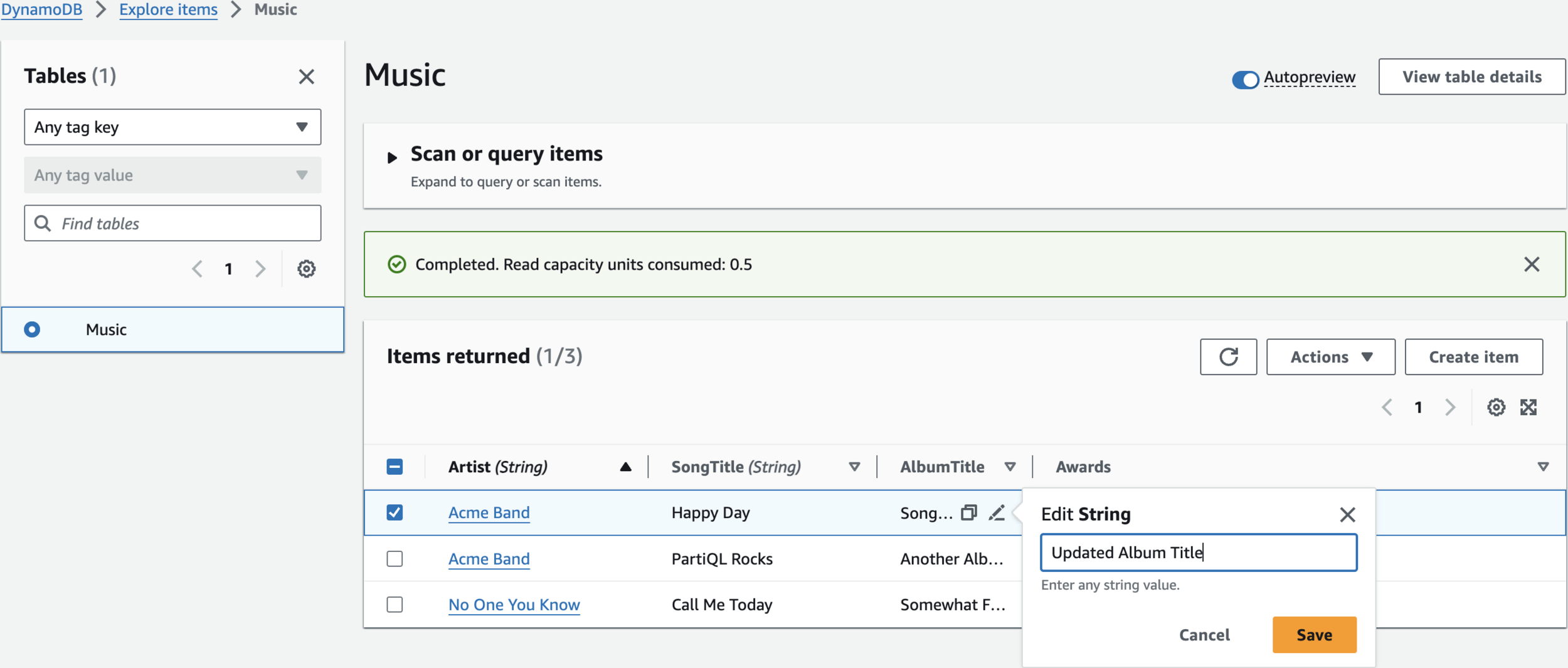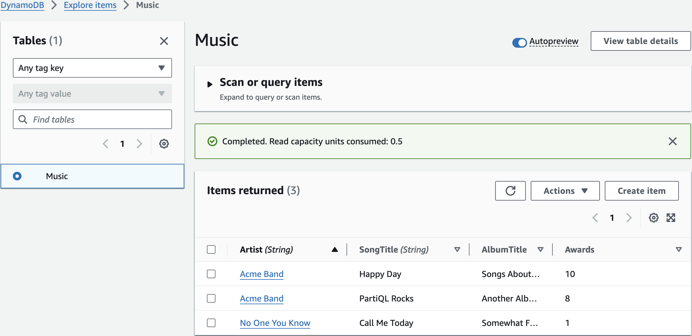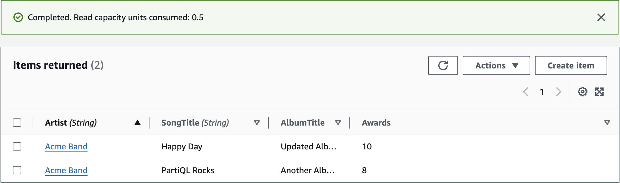 MusicArtistSongTitleNo One You KnowCall Me Today1Somewhat FamousAwardsAlbumTitleAcme BandHappy DaySongs About Life10AwardsAlbumTitleAwardsAlbumTitleAnother Album TitleAcme BandPartiQL Rocks8Updated Album TitleAcme BandAlbumTitleSomewhat Famous