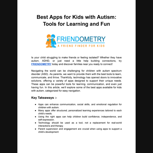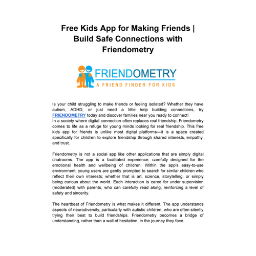 Friendometry helps parents connect with nearby families to create meaningful, in-person friendships for their children. Join our secure and trusted platform to end childhood loneliness and build lasting social connections. Take the first step today! for more information visit :- https://friendometry.com/best-apps-for-kids-with-autism/