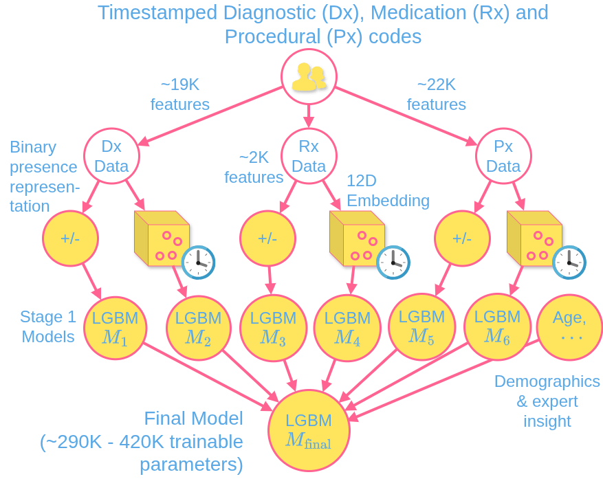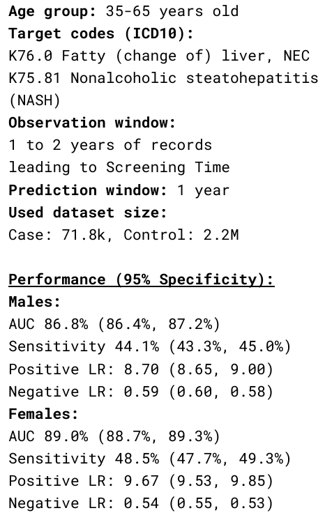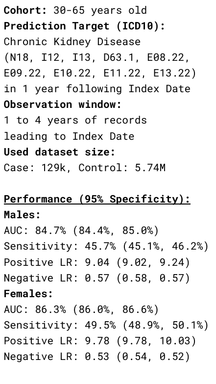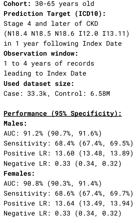 Curated Disease-agnostic Features | Odds ratio dictionaries combined with multi-stage LGBMs | Specialized HMM based Longitudinal Tracking*