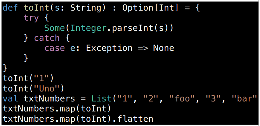 toInt?toInt?toInt("1")?toInt("Uno")?txtNumbers?txtNumbers.map(toInt)?flatten?def toInt(s: String) : Option[Int] = {