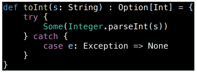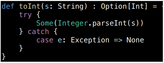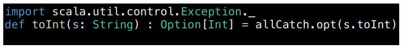 def toInt(s: String): Option[Int] = allCatch.opt(s.toInt)