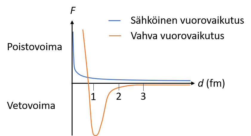 - Kun nukleonit ovat riittävän lähellä toisiaan, ne voivat tuntea naapurihiukkasen vahvan vuorovaikutuksen
