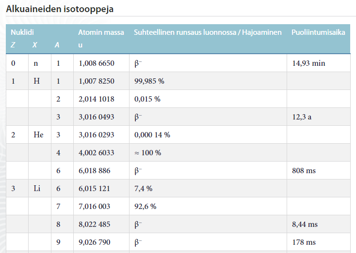 - Taulukkokirjan isotooppitaulukossa on kunkin atomin massa