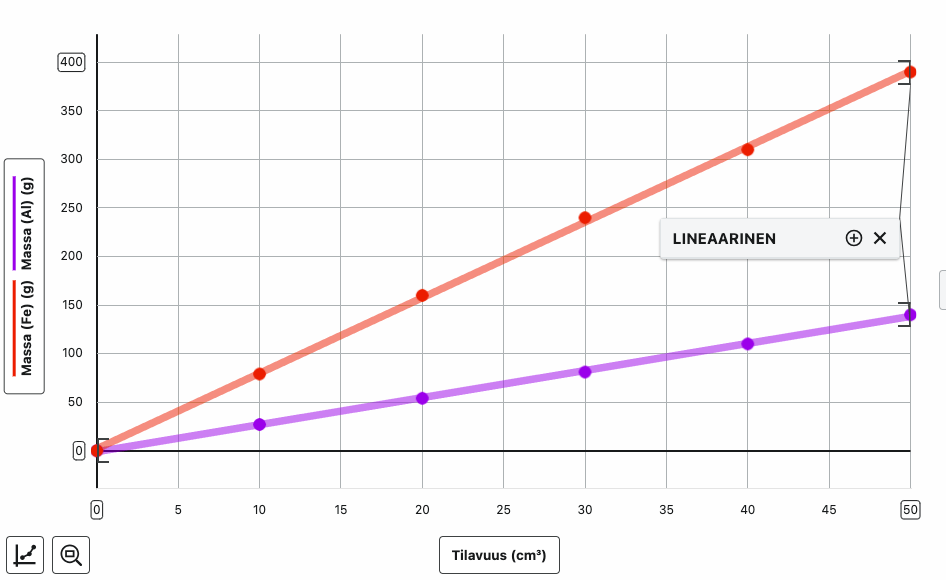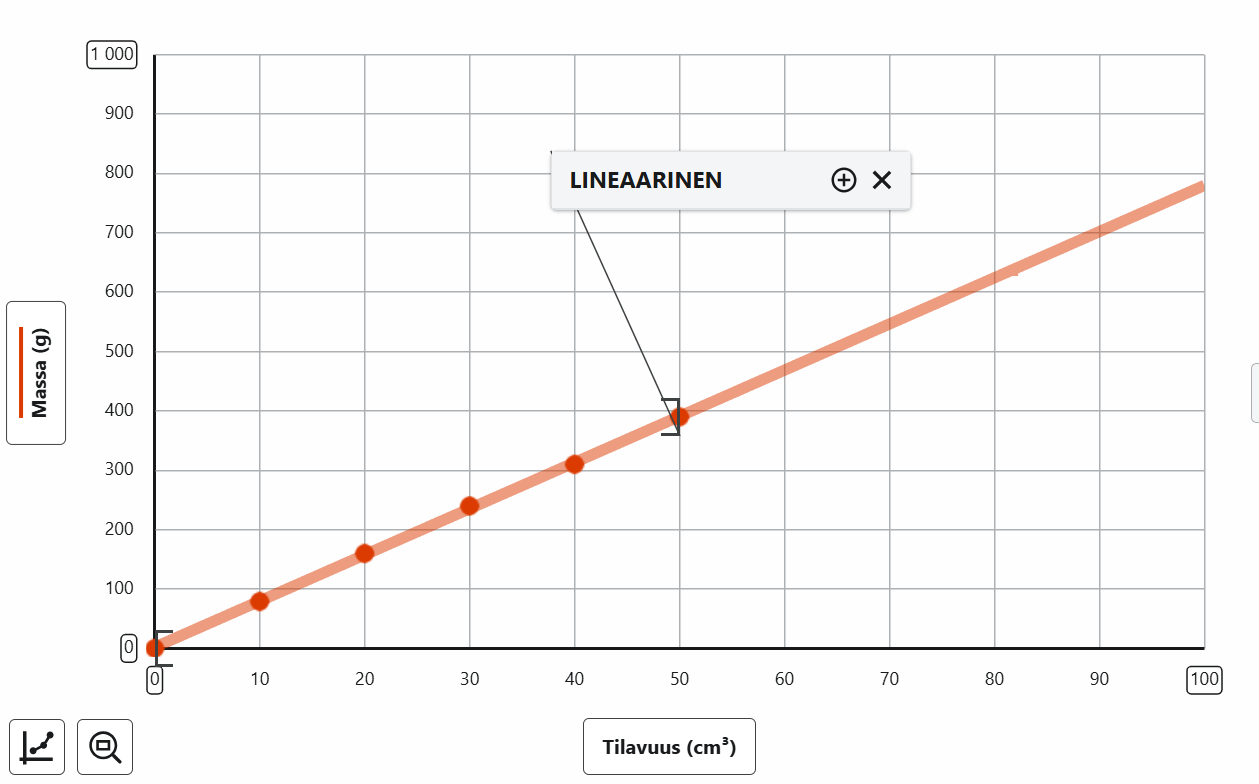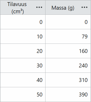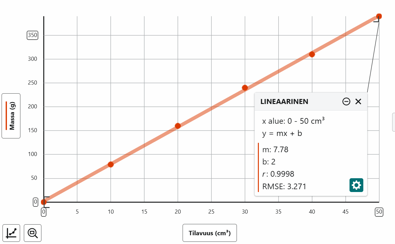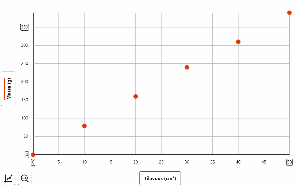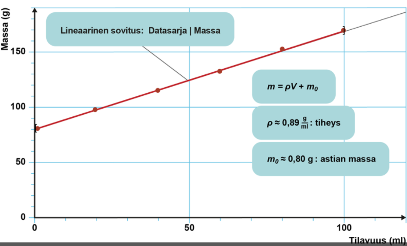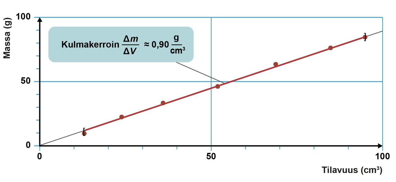 - Kuvaajaksi, jossa massa on esitetty tilavuuden funktiona