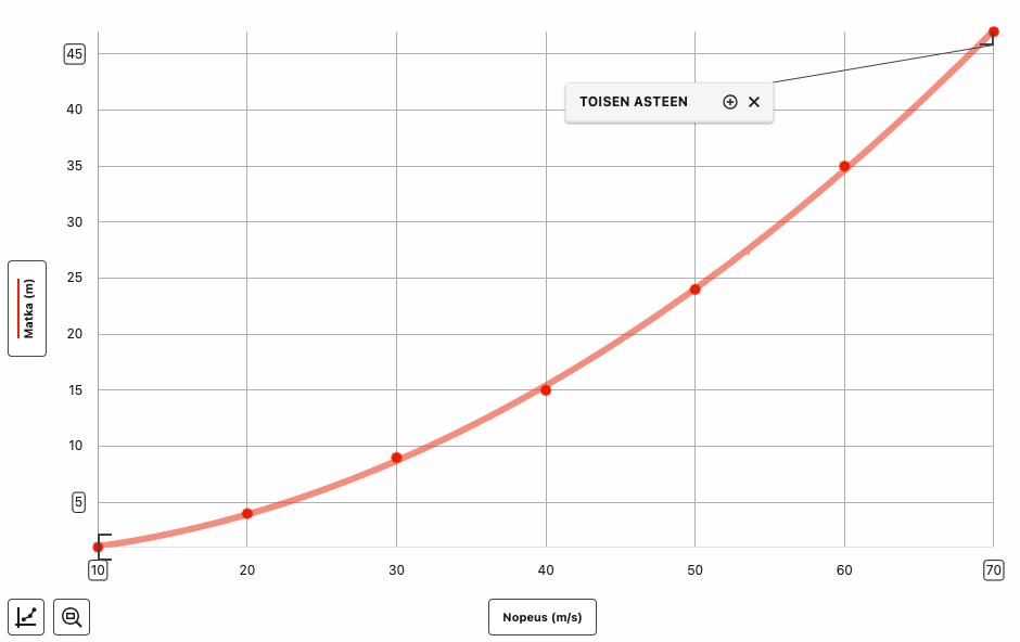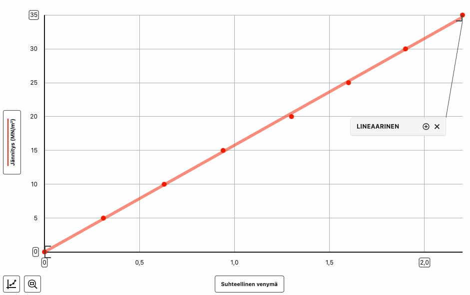 - Kuvaajan avulla voidaan interpoloida tai ekstrapoloida (huomioi pätevyysalue). Säädä tarvittaessa akseleiden asetuksia.