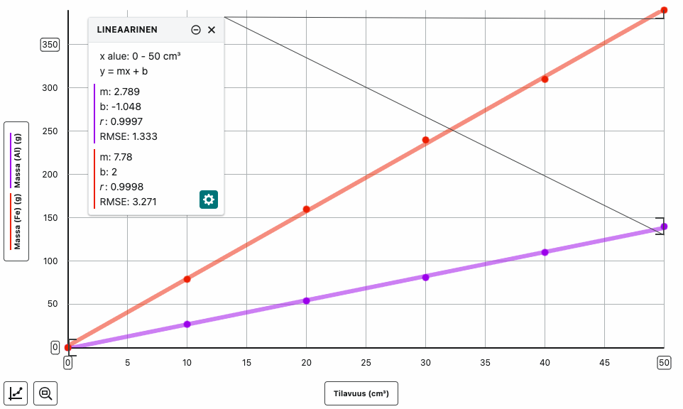 Etsi MAOL-taulukoista alumiinin ja raudan tiheydet ja vertaa niitä suoran kulmakertoimiin.