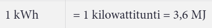 - Voimalaitoksissa tai kotitalouksissa energian määrä ilmaistaan usein yksiköllä kWh (kilowattitunti)