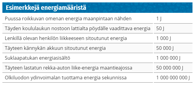 Energia E, perusyksikkö on J (joule)
