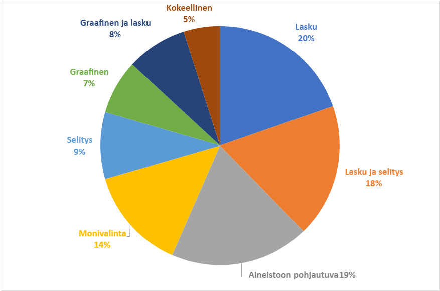 - Aineistojen hyödyntämistä, kaavan johtamista, kuvaajan tulkintaa, usein vieras fysiikan konteksti