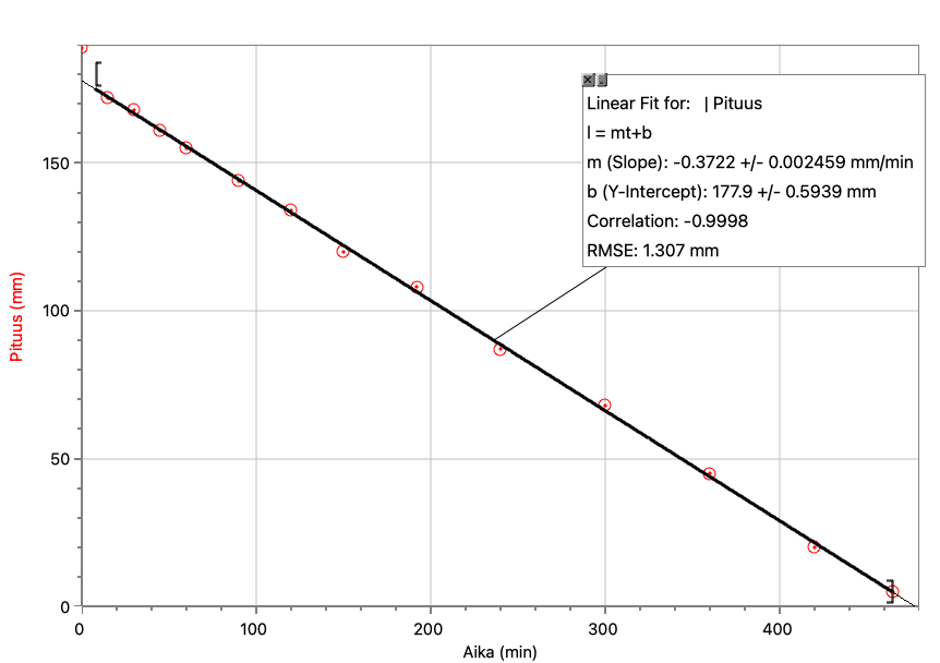 - Logger Pro laskee suoran sovituksen yhteydessä kulmakertoimen virheen pienimmän neliösumman menetelmän avulla