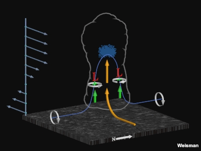 - Nousuvirtaus taivuttaa vaakapyörrettä muodostaen syklonaalisen ja antisyklonaalisen pystypyörteen
