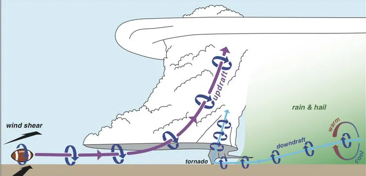 - Mesosyklonin keskuksessa nousuvirtaus kallistaa vaakasuuntaisen pyörteisyyden pystyyn (mesosyklonin alaosa)