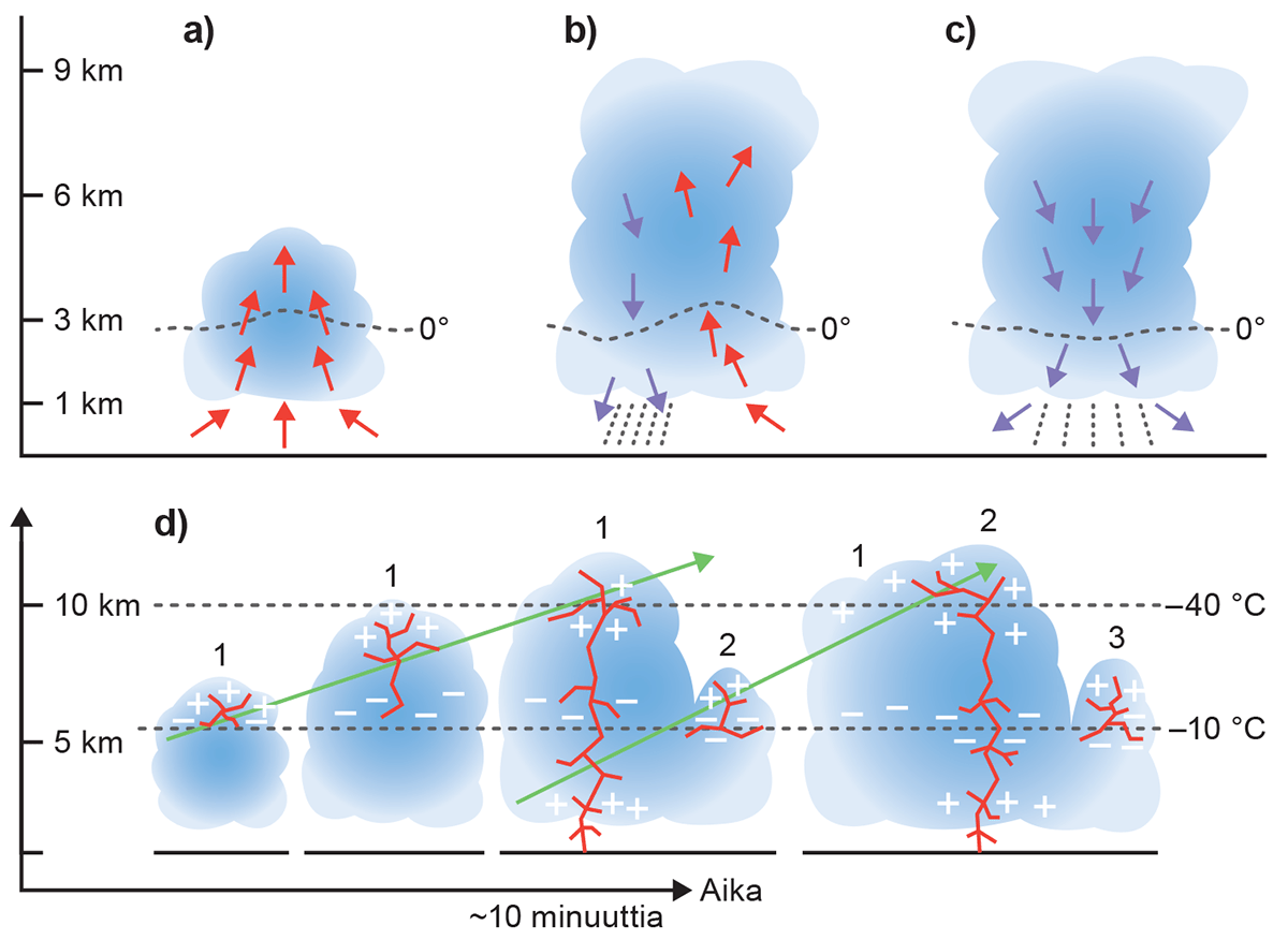 - Jääkiteet varautuvat positiivisesti, lumirakeet negatiivisesti