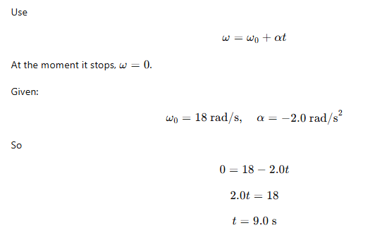 & 2.0~\mathrm{rad/s^2}. \text{The time it takes to stop is:} \\[4pt]