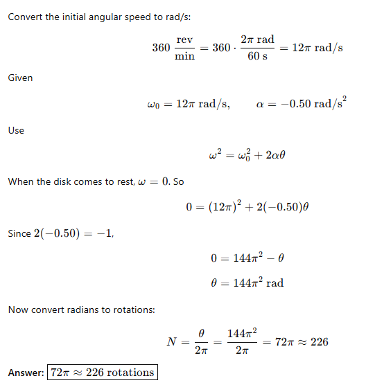 &\text{of $-0.50 \mathrm{~rad} / \mathrm{s}^2$. }\text{How many rotations does the disk make before coming to rest?}\\