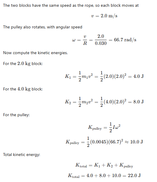 &\text{to the other. When the speed of the heavier block is } 2.0~\text{m/s, find the total kinetic energy } \\