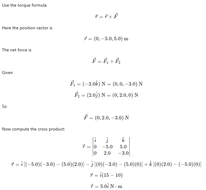&\text{What is the net torque about the origin on an object located at } (0, -5.0, 5.0)~\text{m} \\