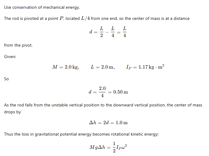 &L/4 \text{ from one end}\text{(see Fig.~7). The rotational inertia of the rod about P is } 1.17~\mathrm{kg \, m^2}.\\