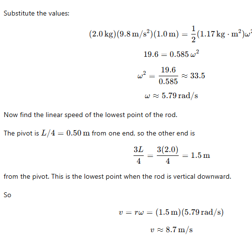&\text{ If it starts rotating from rest, what is the} \text{linear speed of the lowest point of the rod as it }\\