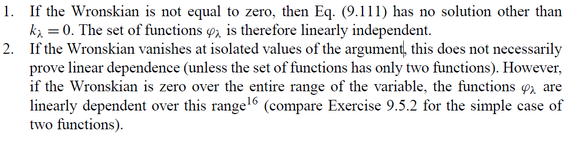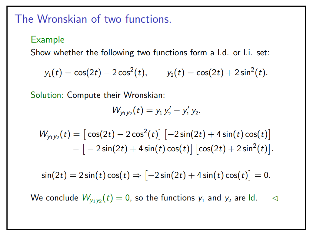 &\textbf{\textcolor{green}{Theorem (Wronskian and Linear Dependence).}} \quad\\