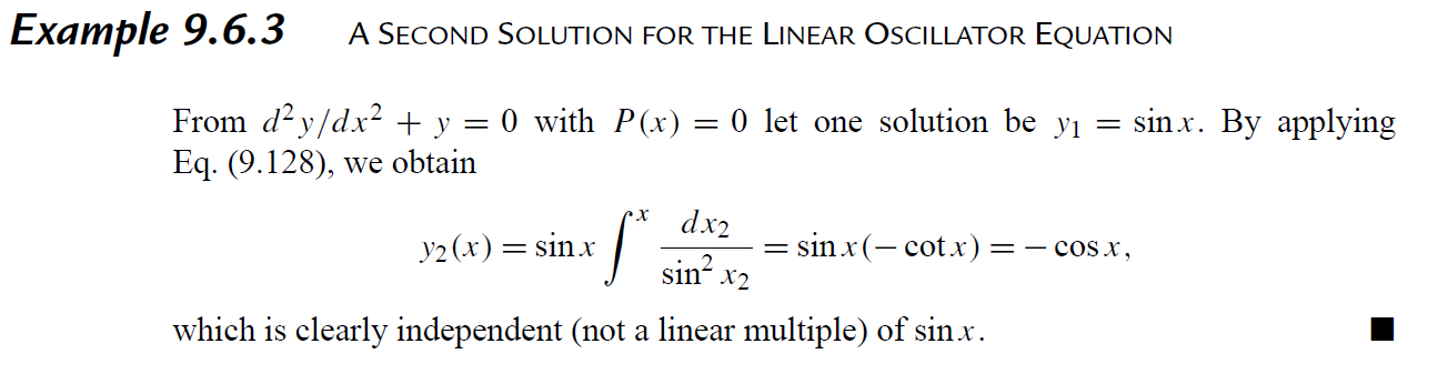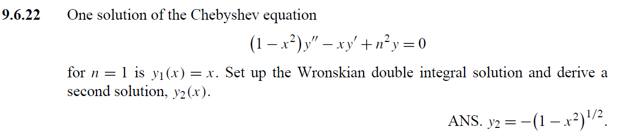 \displaystyle y_2(x)=y_1(x) \int^x \frac{\exp \left[-\displaystyle \int^{x_2} P\left(x_1\right) d x_1\right]}{\left[y_1\left(x_2\right)\right]^2} d x_2 .
