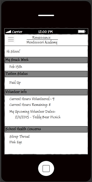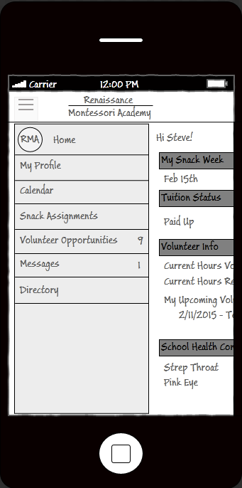 The menu will display all features parents will have access to. It can also display counts like the number of messages and number of volunteer opportunities.