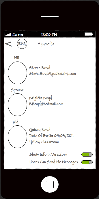 This screen will allow a parent to view their information. The circle represents a profile photo. They can also toggle whether or not they want to receive in-app messages or have their info displayed in the directory.