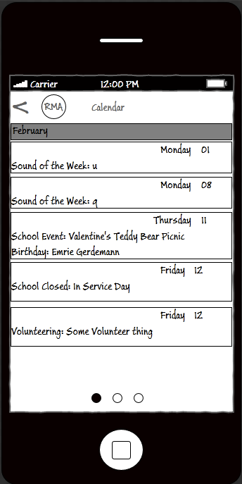 This screen will allow a parent to view birthdays, which are pulled in automatically, sound of the week, closures, dates they've signed up to volunteer for something, and school events. Parents can also swipe to see the next two months of dates.
