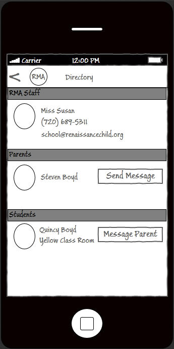 Here parents can quickly call or email RMA. They can also select Parents to send in-app messages to and put names to faces.