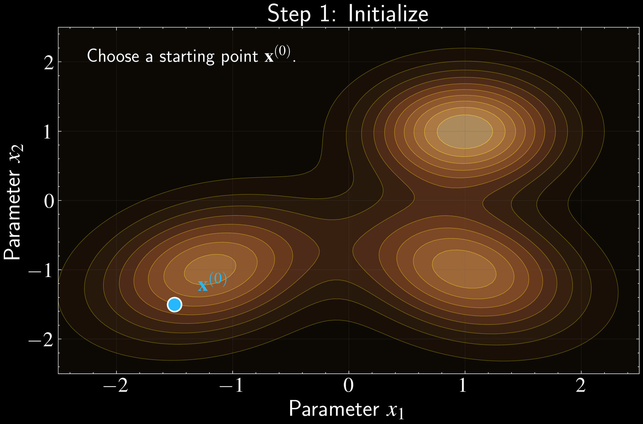 Initialize: Choose starting point \(\mathbf{x}^{(0)}\) in parameter space