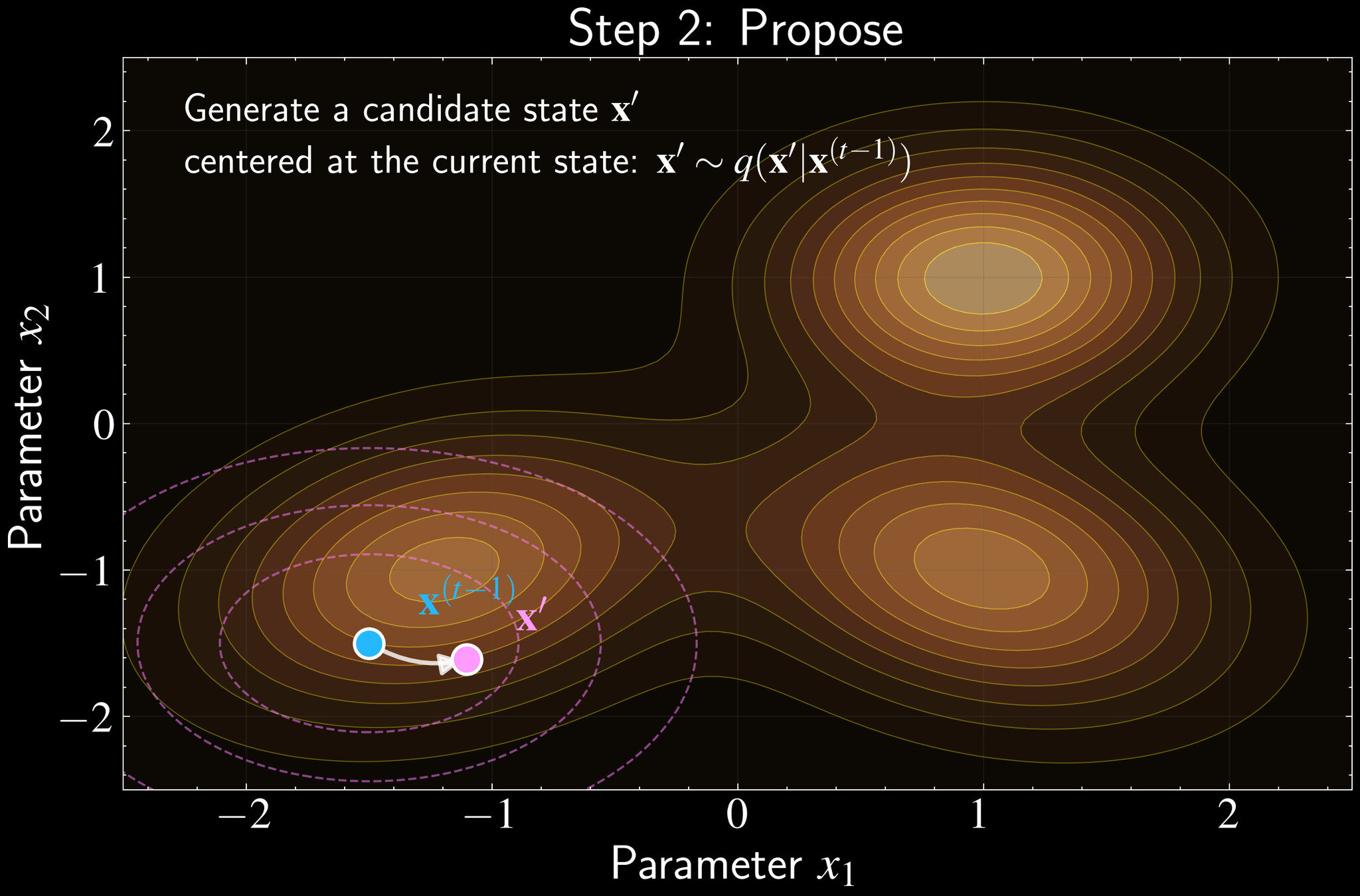 Propose: Generate candidate \(\mathbf{x}' \sim q(\mathbf{x}'|\mathbf{x}^{(t-1)})\) using symmetric proposal