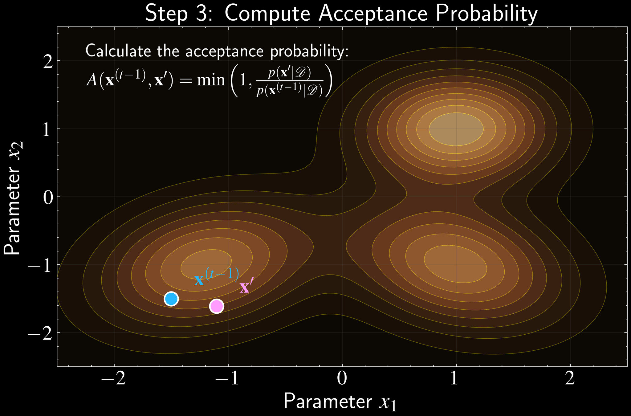 A(\mathbf{x}^{(t-1)}, \mathbf{x}') = \min\left(1, \frac{p(\mathbf{x}'|\mathcal{D})}{p(\mathbf{x}^{(t-1)}|\mathcal{D})}\right)