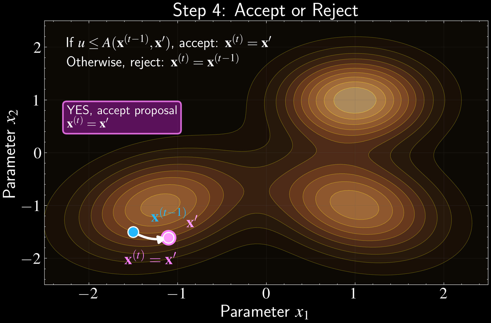 If \(u \leq A\), accept: \(\mathbf{x}^{(t)} = \mathbf{x}'\)