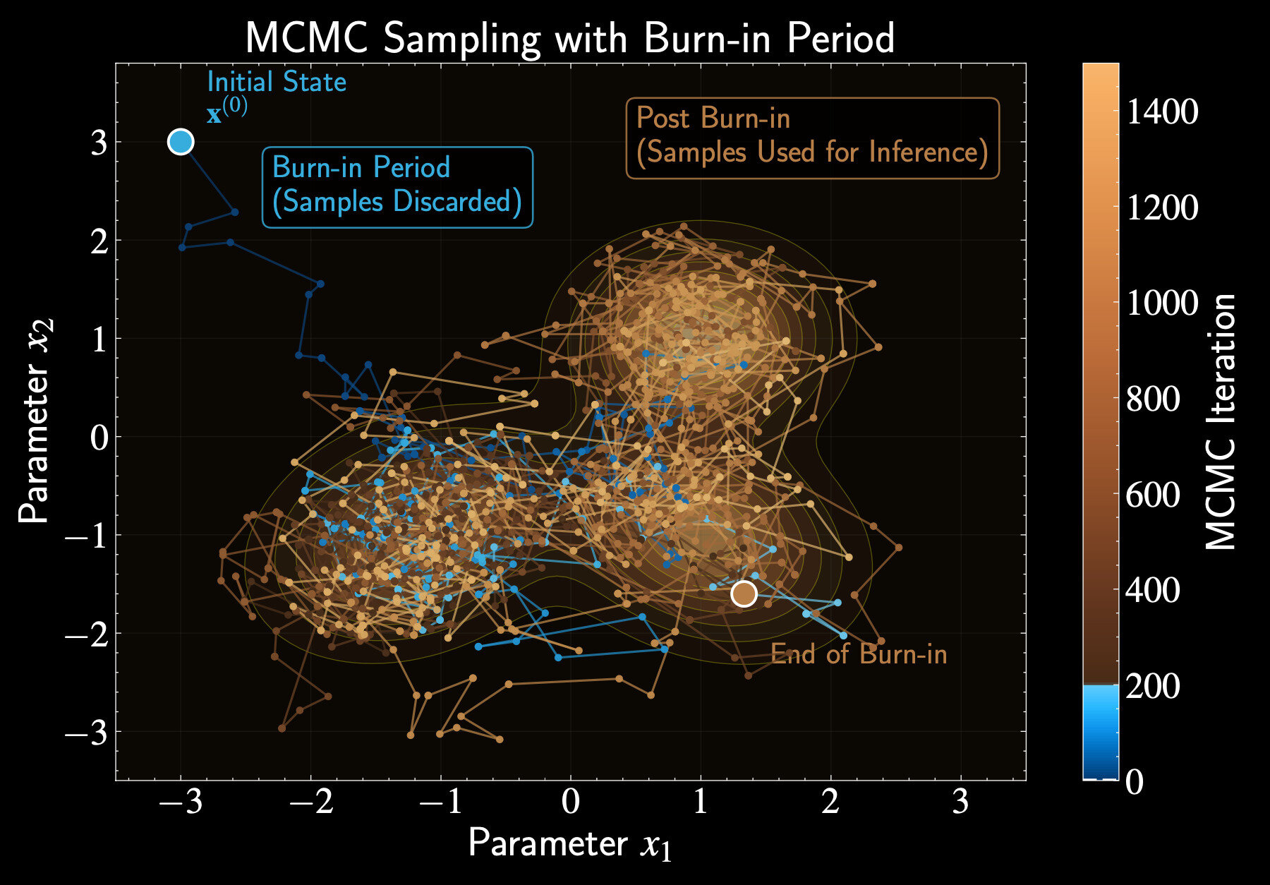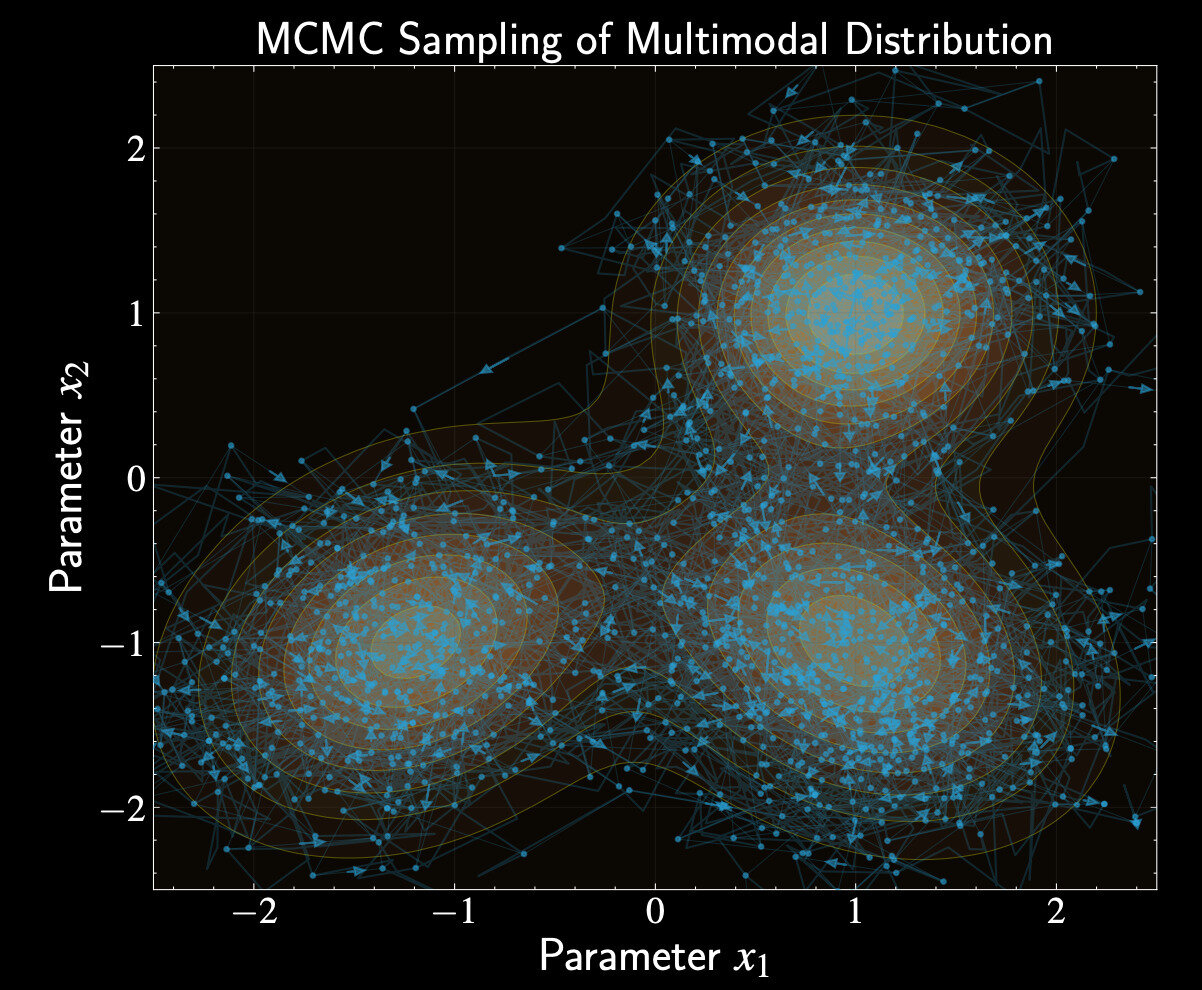 After enough exploration, each footstep of the traveler becomes a sample from our posterior