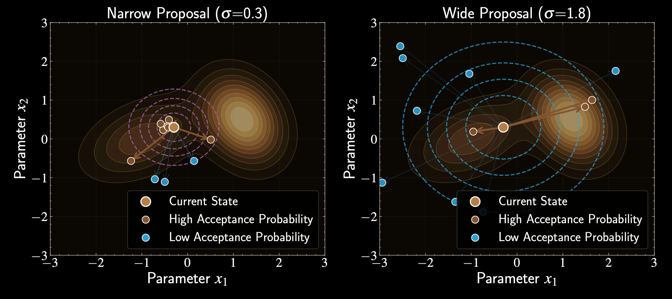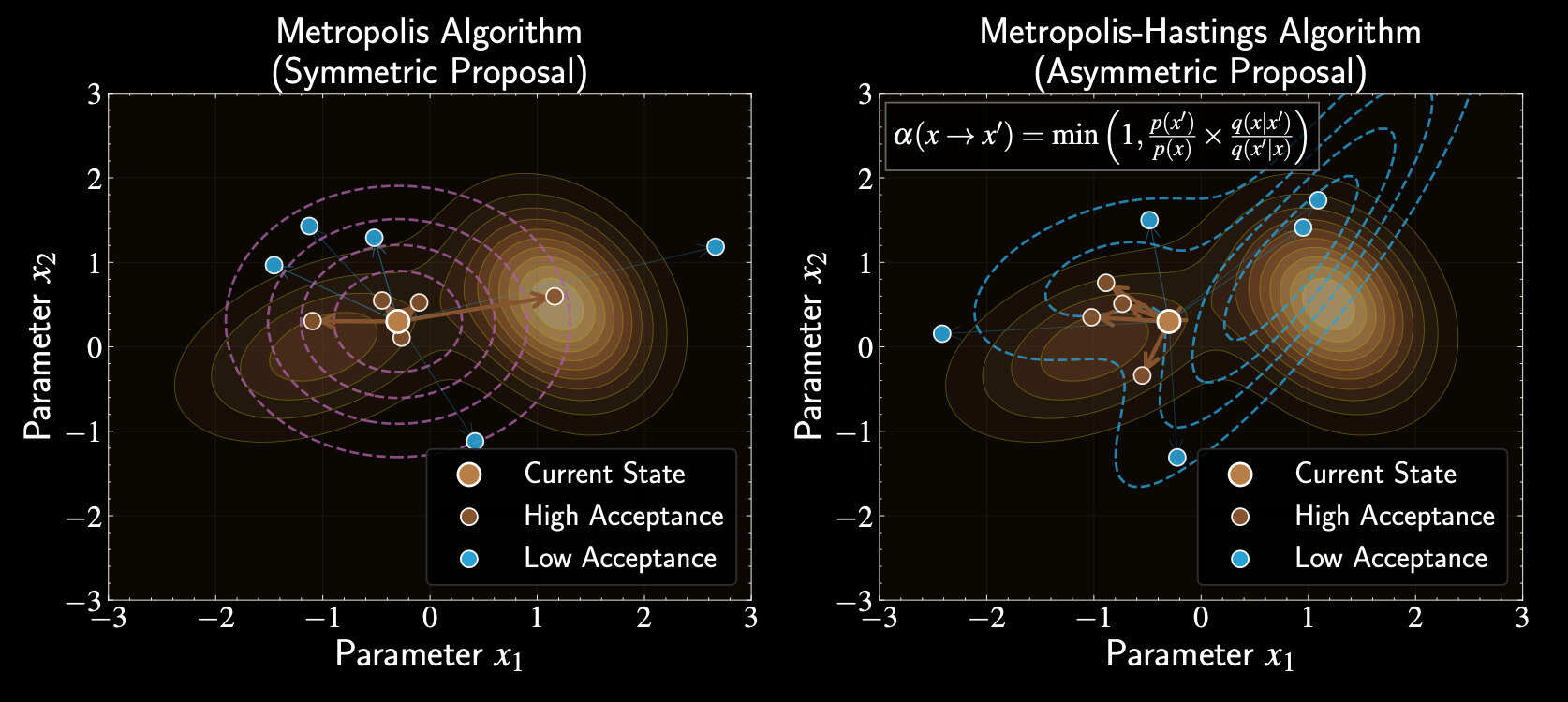 Proposal distribution \(q(\mathbf{x}'|\mathbf{x})\) can be asymmetric: \(q(\mathbf{x}'|\mathbf{x}) \neq q(\mathbf{x}|\mathbf{x}')\)