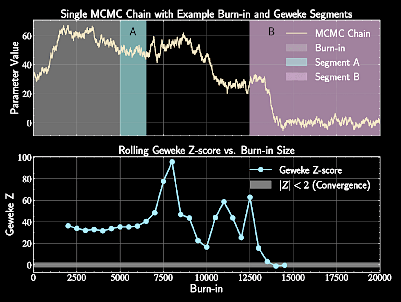 Compare th first segment mean \(\bar{x}_A\) (first 10% of post-burn-in chain) with the last segment mean \(\bar{x}_B\) (typically last 50%)