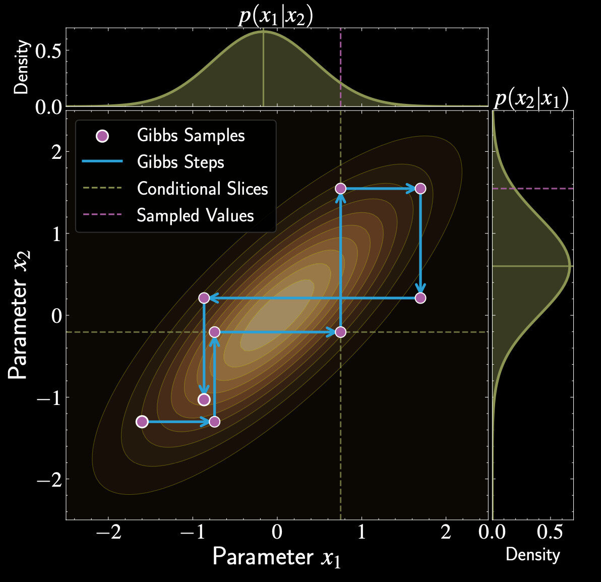 Need conditional distributions \(p(x_1 | x_2)\) and \(p(x_2 | x_1)\)